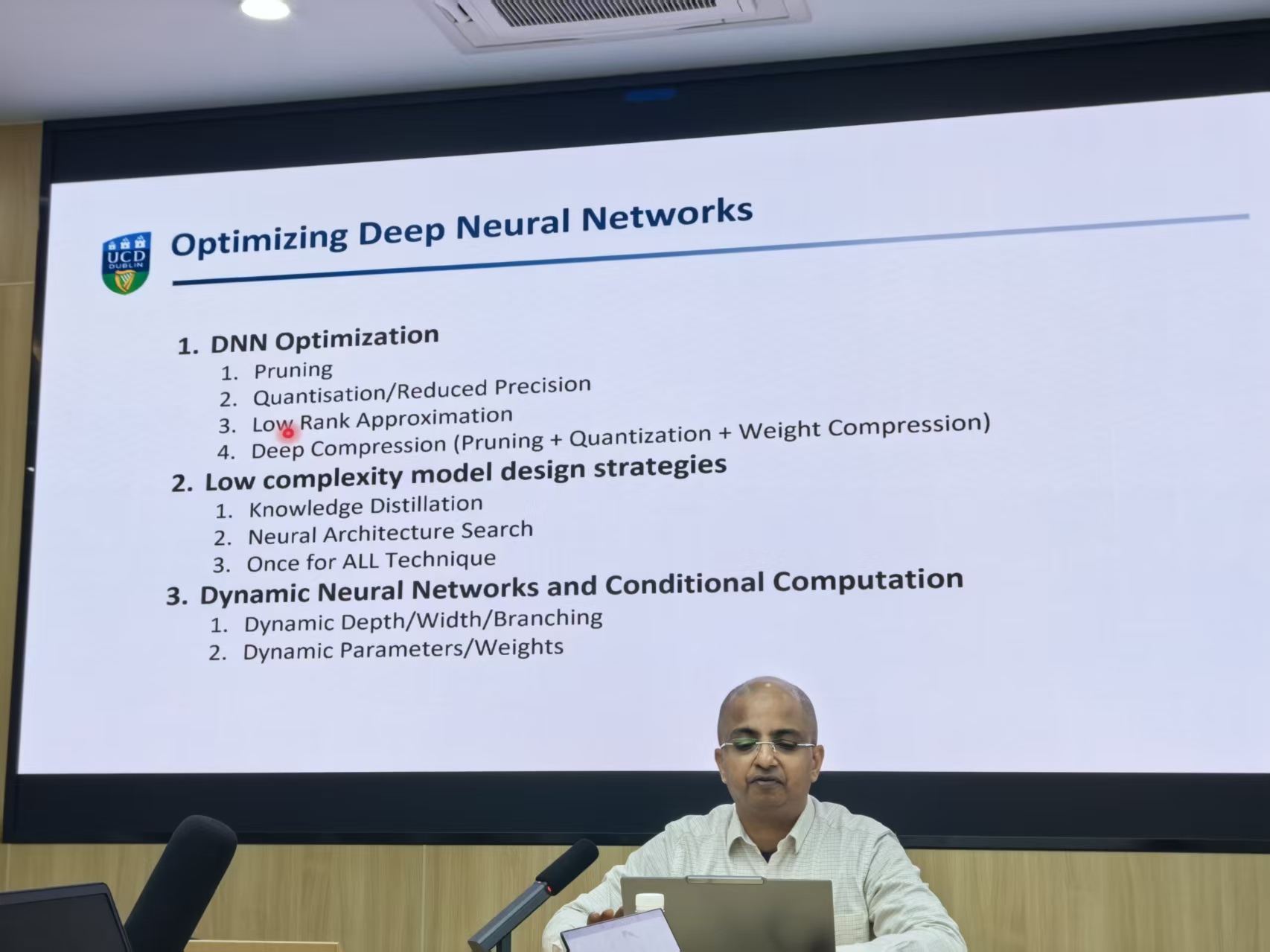 爱尔兰都柏林大学Deepu John助理教授从硬件友好型AI模型的设计角度,系统阐述了包括结构化剪枝、低比特量化、低秩近似及知识蒸馏在内的多种轻量化技术。他特别分析了不同压缩技术在硬件部署中的实际代价与收益,并介绍了动态深度、宽度及参数化网络如何实现“按需计算”,有效提升推理能效。这些方法为构建算法-硬件协同优化的智能计算系统提供了扎实的理论依据与实用工具。