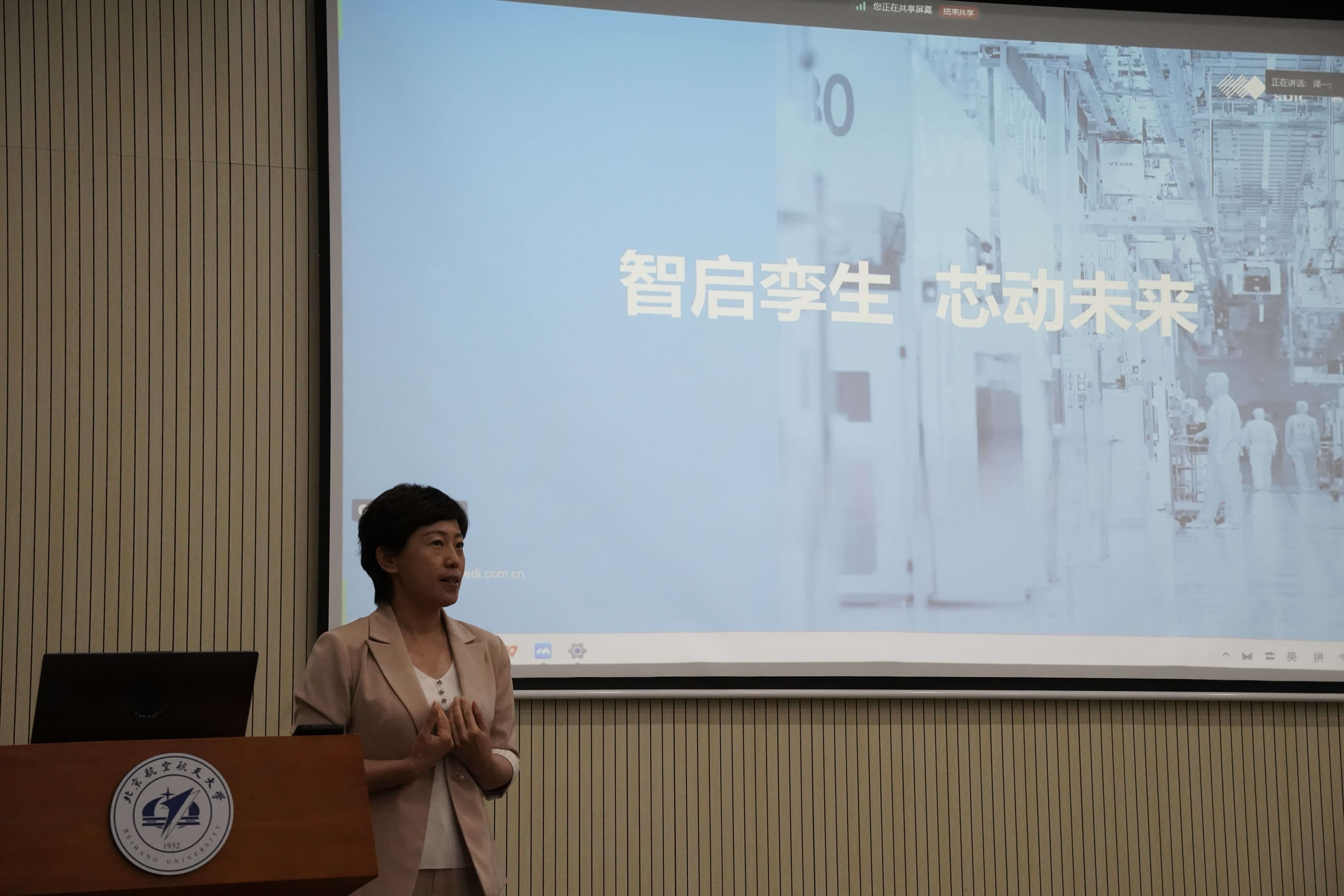 集成电路学院常务副院长张悦向同学们抛出问题“为什么要来北航学集成电路”,从同学们的心底唤起对于“中国芯”的热情,同时介绍了学院的发展历程和整体情况,并希望中国的集成电路产业有更多有志青年的加入和贡献。