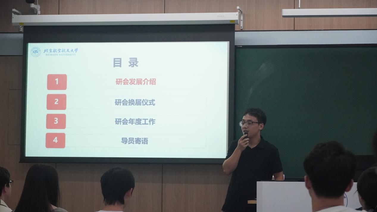 会议伊始,第四届研会主席团成员李昌昱同学向与会人员介绍集成电路学院研会的发展历史。他详细说明了研会的组织架构及人员组成、活动内容及发展重点、以及目前的发展现状和评优成绩。李昌昱同学介绍,学院研会由主席团以及学术部、就业部和文体部三个部门组成,三个部门各司其职,始终坚持以服务学院、服务同学为本,在过去已经开展了许多丰富多彩的品牌活动,并将进一步的努力创新活动形式、扩大活动覆盖面。同时,他代表研会对新成员的加入表示热烈欢迎,期待未来与大家共同奋斗、共成长,不断提升研会的综合水平。