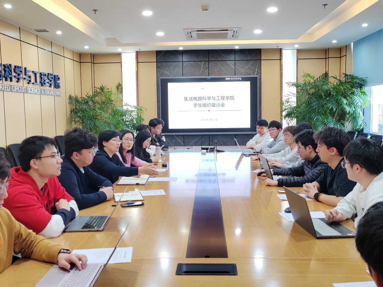 为加强学生组织间联动协作,凝聚青春力量,共同助力服务同学成长与学院文化建设,集成电路科学与工程学院于3月21日召开学生组织座谈会,学院党委书记高静、专职辅导员丁瑞云、胡晏铭、邓修齐与分团委、学生会、研究生会、新闻中心学生学生代表共同参与交流,座谈会由专职辅导员丁瑞云主持。