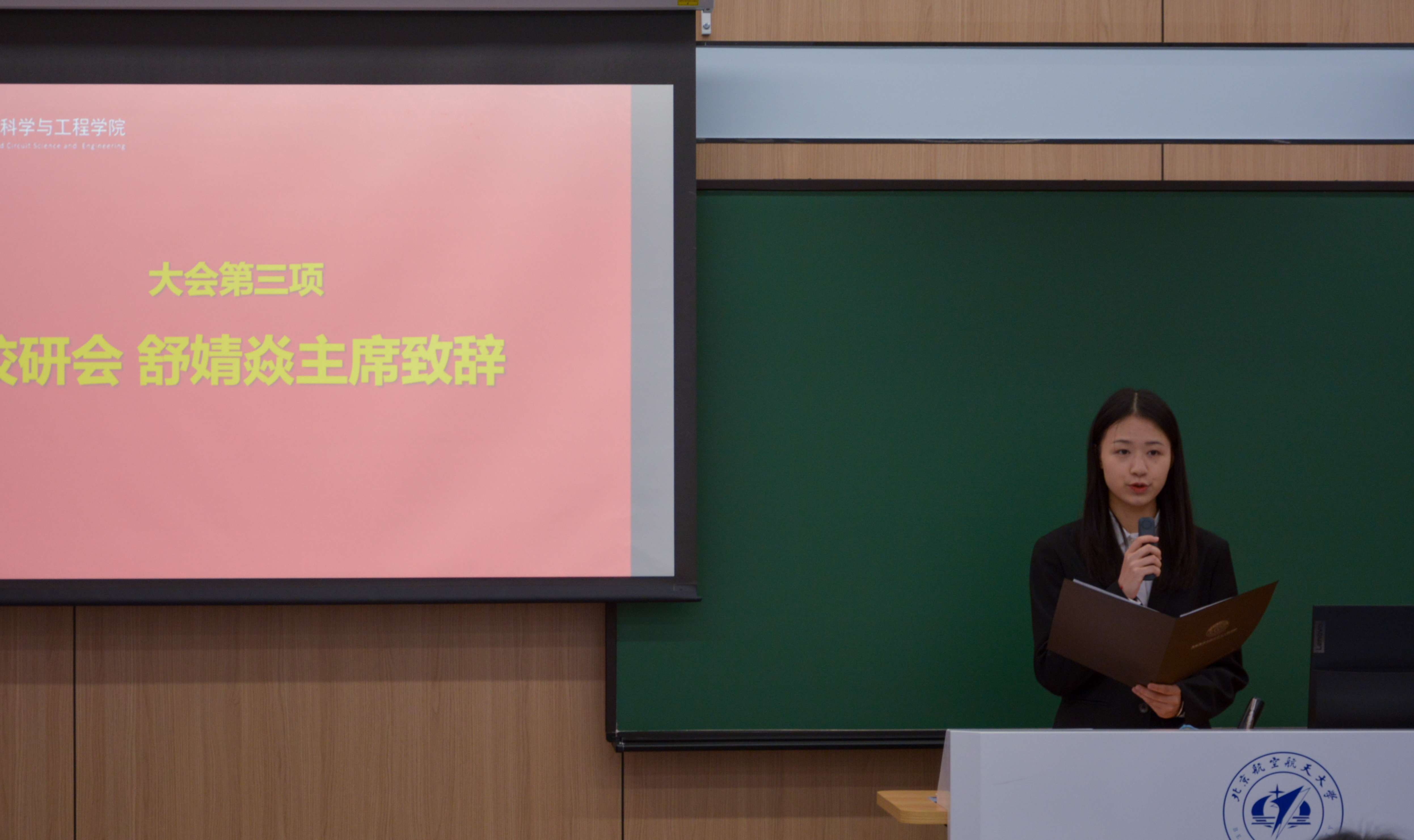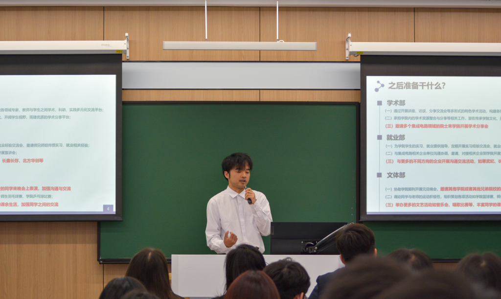 校研究生会主席团成员舒婧焱首先致辞,她充分肯定了集成电路科学与工程学院研究生会过去一年的工作成果,希望新一届研会继续加强校院联动,发挥桥梁纽带作用,更好地服务同学成长成才。