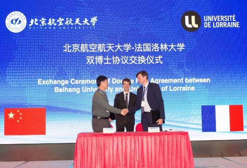 北航电子信息工程学院党委书记刘建伟与Stephane Mangin教授分别代表两校签署并交换了《北航-洛林大学双博士协议》。根据协议,两校将在教学、科研领域开展全方位合作,并对交换的博士生授予本校博士学位。协议的签署为双方的进一步交流合作操作了有利条件,也标志着双方的合作进入崭新阶段。