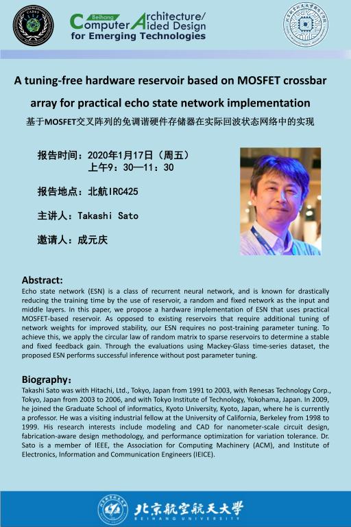 1月17日Takashi Sato教授学术报告《基于MOSFET交叉阵列的免调谐硬件存储器在实际回波状态网络中的实现》
