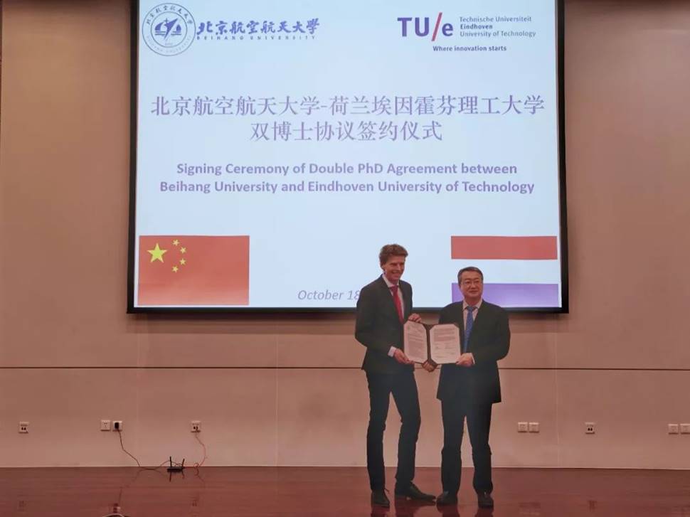 值得一提的是,北航与埃因霍芬理工大学博士双学位启动仪式也顺利举行,由北航黄海军副校长与荷兰埃因霍芬理工大学的Bert Koopmans教授交换两校双博士学位协议。